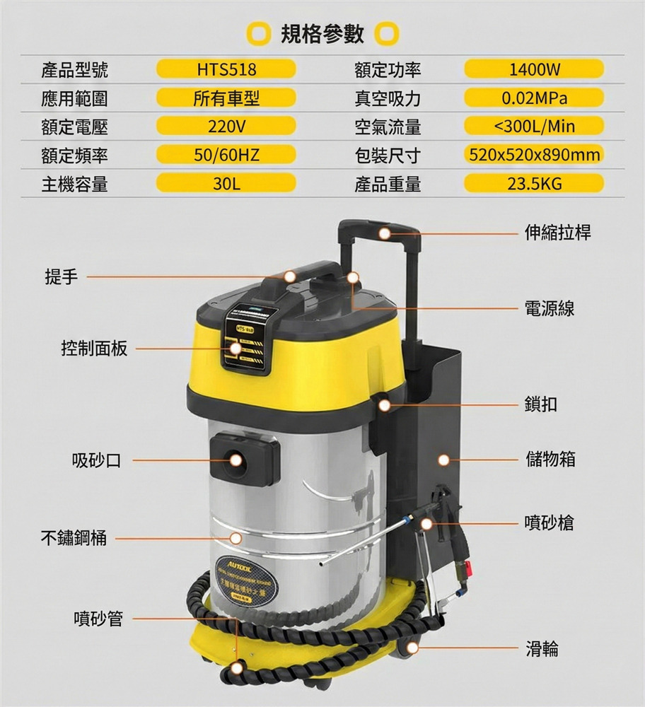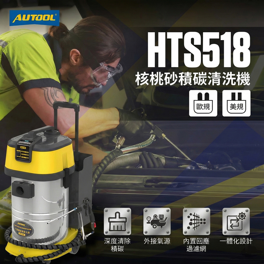 直購價=1個的售價HTS518汽車核桃砂積碳清洗機,該產品是通過高壓氣流噴進發動機進氣管道內,高壓高速的砂粒會在封閉的進氣管道內翻滾和撞擊,從而把進氣門及缸壁上的積碳衝擊下來,然後通過專門的接頭把核桃砂及積碳混合物回收到儲砂桶中。